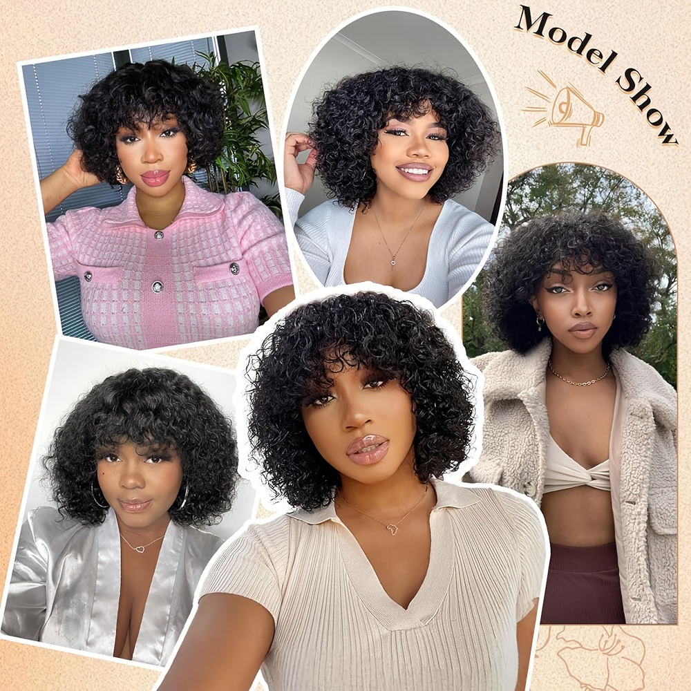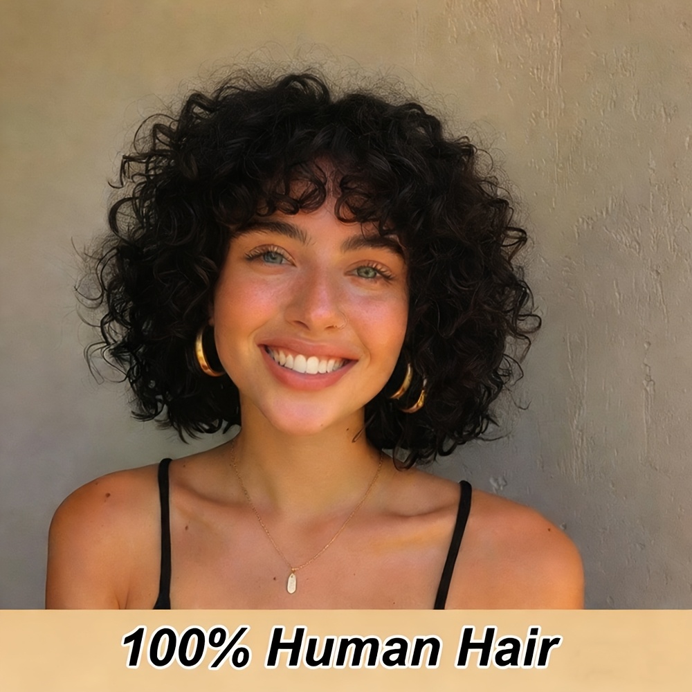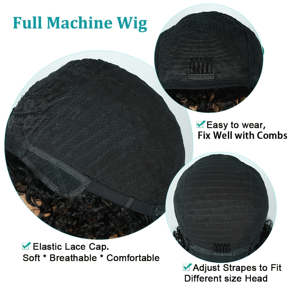 180% Density Water Wave Curls Pixie Cut Human Hair Wig | Machine Made Bob Wig with Bangs, Natural Black Color, 8\u002F10 Inch, Rose Net