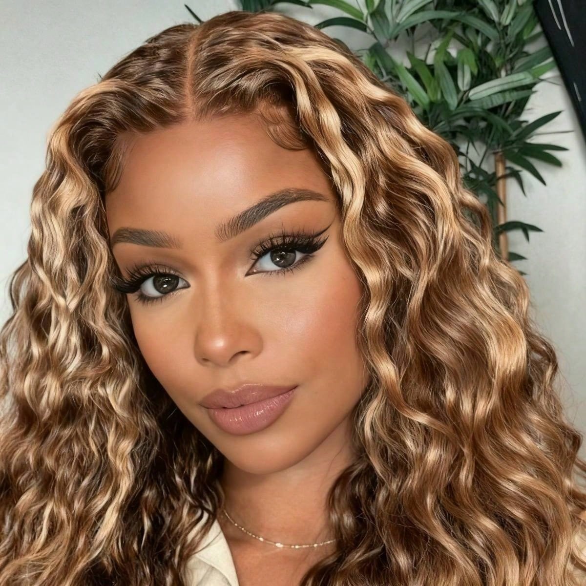 Glueless Blonde Ombre Highlight Human Hair Wig with Kinky Curly\u002FDeep Wave Texture - 250% Density HD Lace Frontal Pre Plucked Baby Hair Blonde Colored for Women ( Look)