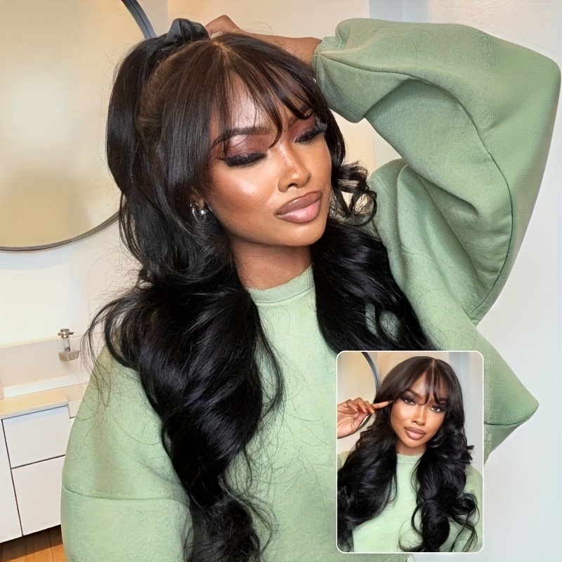 YIROO HAIR 7x5 Lace Frontal Wig with Bye Bye Knots - Natural Black Fluffy Hair, 180% Density Loose Wave Frontal Hairpiece with Curtain Bangs & Drawstring Closure (No Glue\u002FTape Needed) for, Put & Go Easy Wear